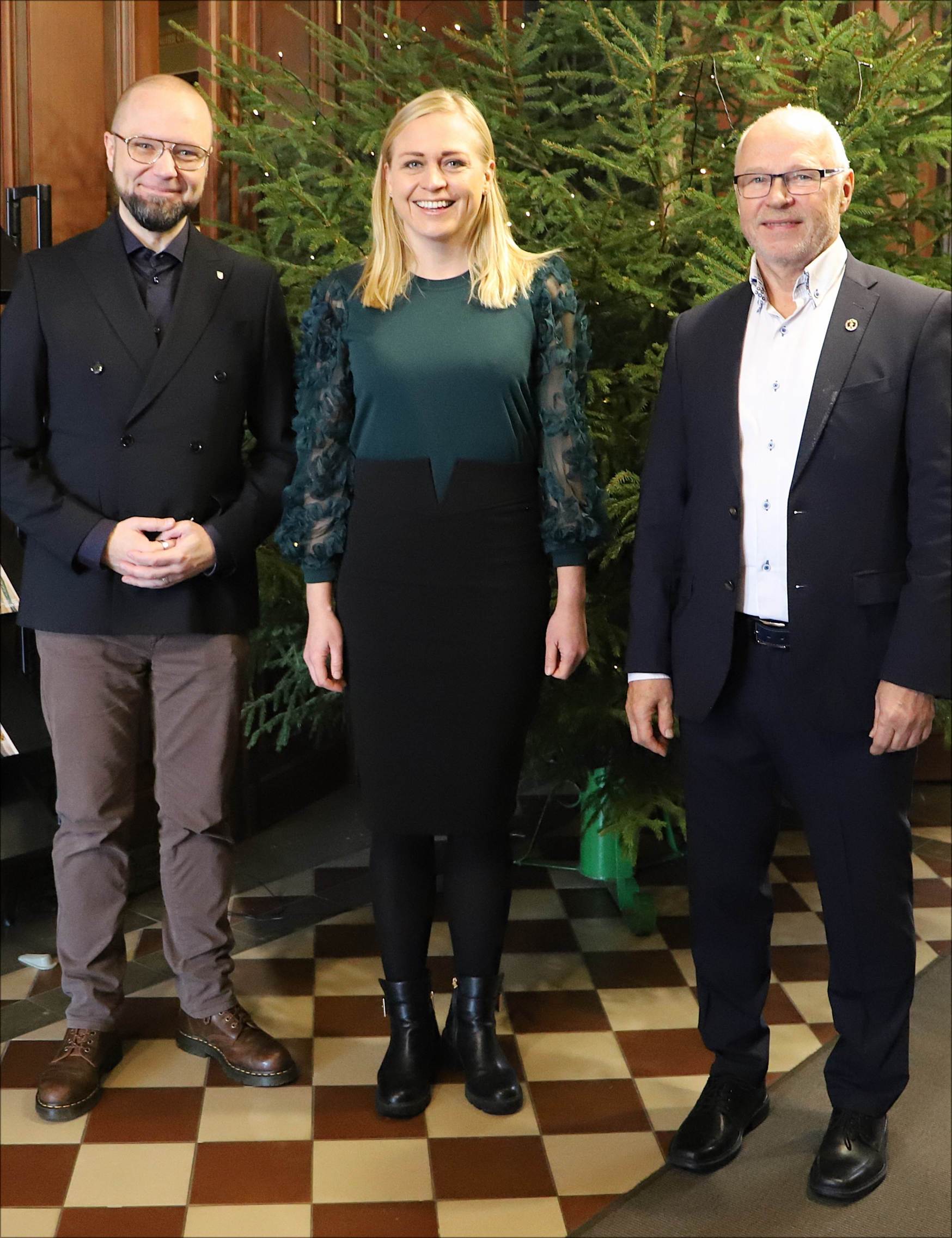 Kuvassa vasemmalta kaupunginjohtaja Olli-Poika Parviainen, ulkoministeri Elina Valtonen ja puheenjohtaja Heikki Lindroth